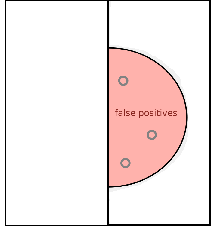 양성으로 예측되었으나 (원 안), 실제는 음성 (○)