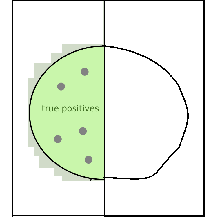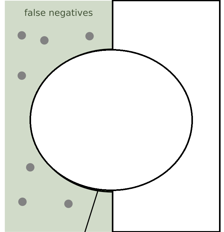 음성으로 예측되었으나 (원 밖), 실제는 양성 (●)